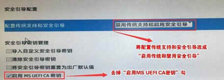 2、点击“先进”,在下方选择进入“安全引导配置”,根据图中指导进行操作就可以了