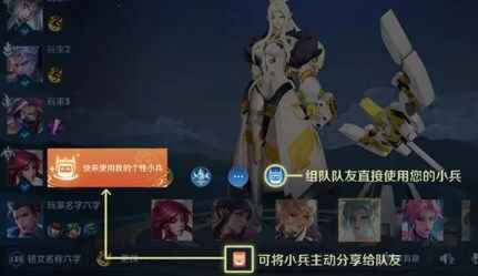 组队时同队伍玩家可以直接使用拥有该特性的小兵选将时也可主动发送分享,点击领取后非组队玩家也可使用。