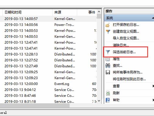 3、点击系统后右侧出现如图所示的界面点击最右侧的筛选当前日志