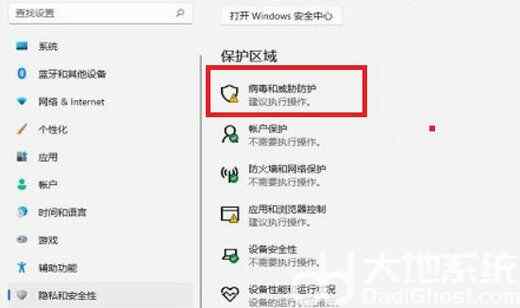 4、打开后,点击保护区域下的“病毒和威胁防护”