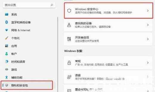 3、然后进入左边“隐私和安全性”打开“Windows安全中心”