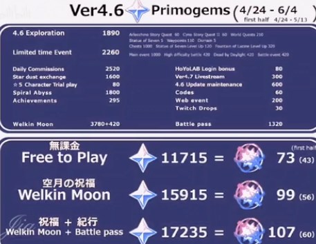 在4.6版本中,零氪玩家能获得9445原石、12个纠缠之缘、19个相遇之缘,具体结果参考如下: