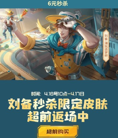 王者荣耀刘备潮玩造梦师什么时候返场?王者荣耀手游在最近开启了多个英雄皮肤的限时返场活动,在这次即将上线的返场皮肤是刘备的六元秒杀皮肤潮玩造梦师,这次的复刻活动将会在4月18日开启,玩家们届时可以在游戏中进行购买,有想要了解更多关于本次刘备潮玩造梦师皮肤返场消息的小伙伴们可以一起来看看接下来的内容介绍。