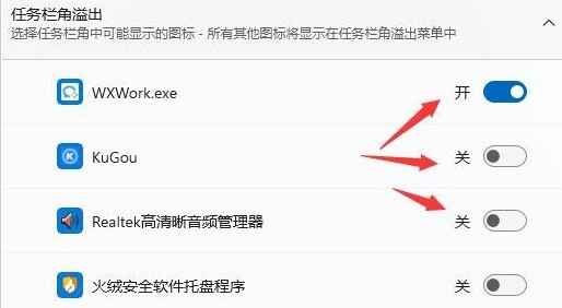 2、在展开“任务栏角溢出”,取消勾选所有出现堆叠的应用程序图标就可以了。