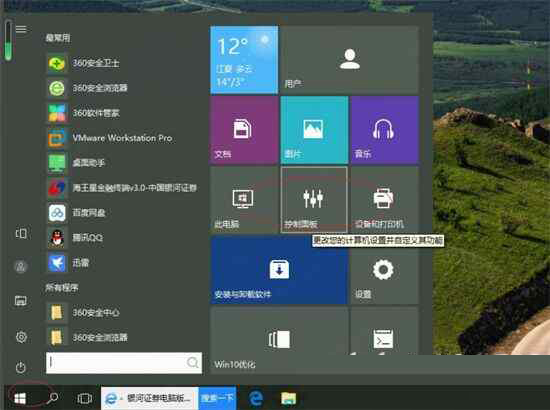 2.点击开始菜单"控制面板"磁贴