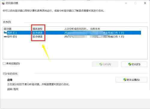 4、进入优化界面,在媒体类型中就可以看到你的硬盘类型了,小编电脑硬盘显示为固态硬盘,如下图所示