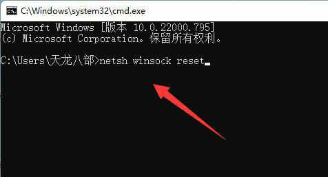 3、打开后输入“netsh winsock reset”回车再重启电脑试试看应该就可以了。