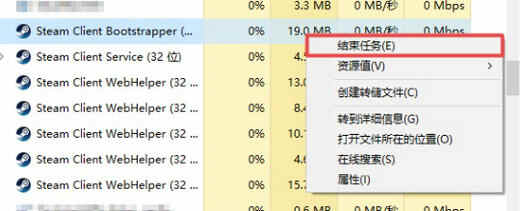 2、然后找到所有steam进程,将他们全部“结束任务”