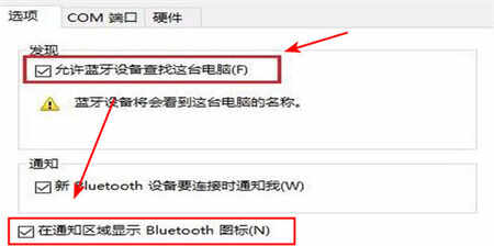 6.最后勾选允许蓝牙设置查找这台电脑与在通知区域显示蓝牙图标然后点击回车即可。