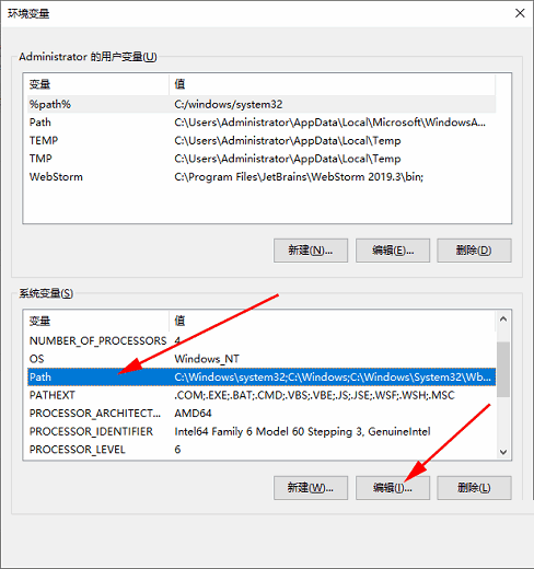 接着在下面的"系统变量"下面,选中变量”Path“,然后点“编辑”按钮。