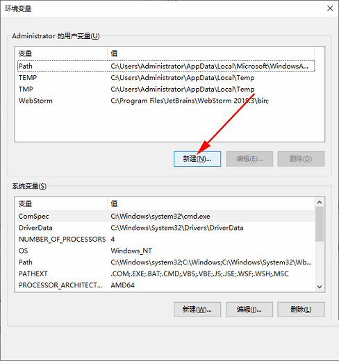 在“环境变量”对话框中,“某某(Administrator) 的用户变量"下面点击”新建“按钮。