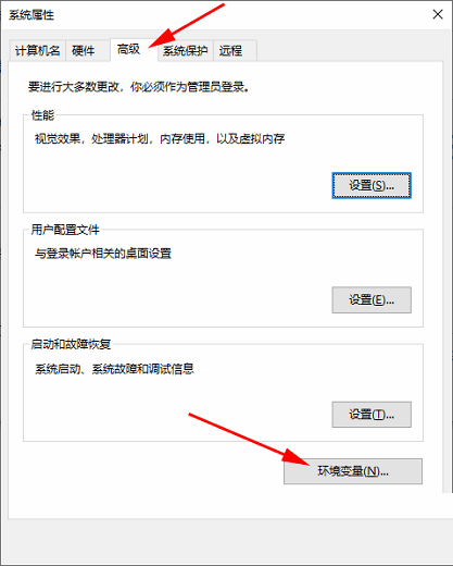 在弹出的“系统属性”对话框中,“高级”选项卡下点击”环境变量“。