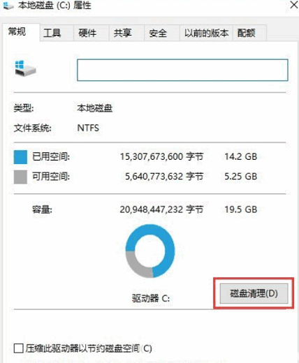 2、之后会打开C盘属性窗口,这时我们点击“磁盘清理”按钮,接下来就会运行磁盘清理工具开始扫描C盘;