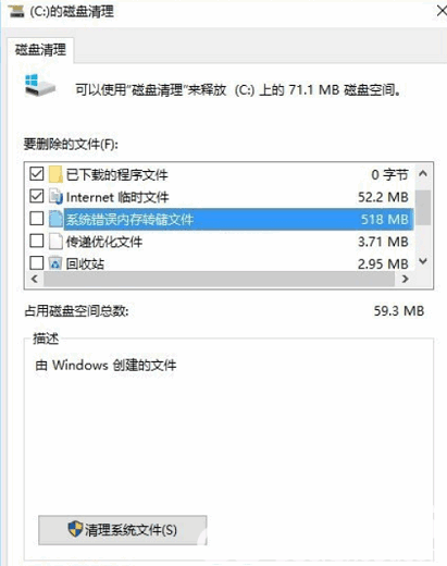 3、然后就会显示“C盘的磁盘清理”扫描结果,在“要删除的文件”列表中我们即可看到“系统错误内存转储文件”,注意到它的大小了吗?足足500多M哦;