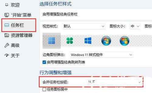 8、打开后,进入左边“任务栏”,将“合并任务栏按钮”改为“从不”