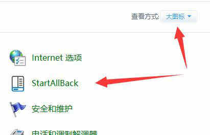 3、搜索并打开“控制面板”,更改右上角“大图标”就能找到并打开startallback