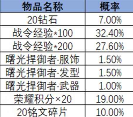 打开可随机获得以下奖励之一:曙光捍御者·服饰、曙光捍御者·发型、曙光捍御者·武器、荣耀积分*20、100/200战令经验、钻石*20、铭文碎片*20。