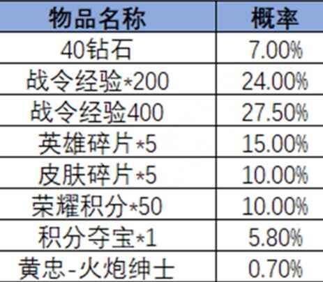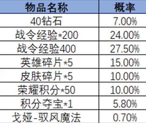 打开可获得以下奖励之一:戈娅-驭风魔法、积分夺宝抵用券*1、英雄碎片*5、皮肤碎片*5、荣耀积分*50、200/400战令经验、钻石*40。