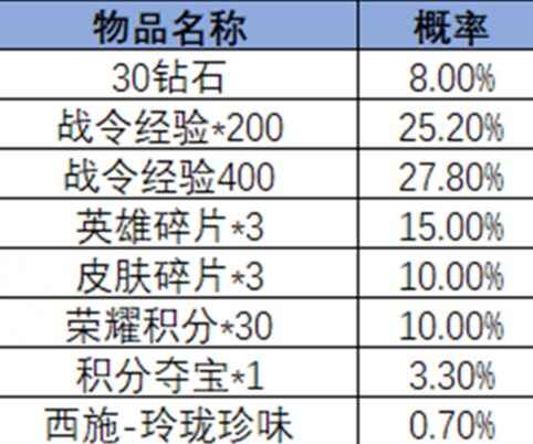 打开可随机获得以下奖励之一:西施-玲珑珍味、积分夺宝抵用券*1、英雄碎片*3、皮肤碎片*3、荣耀积分*30、100/200战令经验、钻石*30。