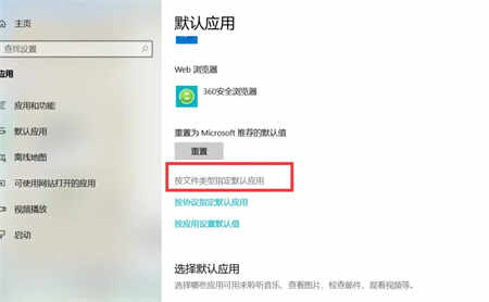 3.进入“应用”页面后选择“默认应用”,点击下方的按文件类型指定默认应用。