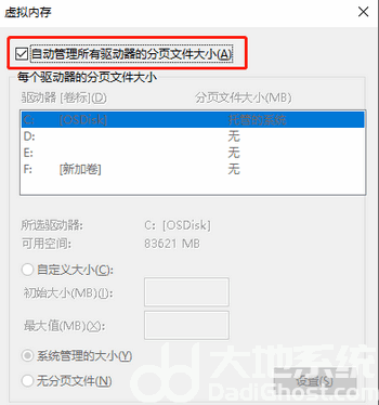 3、更改-把“自动管理所有驱动器的分页文件大小”前的勾点掉;