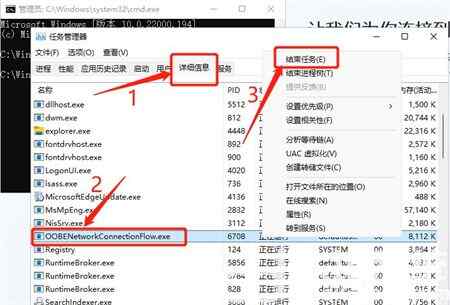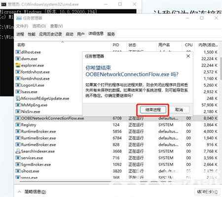2.我们在进入到这个需要联网才能进行下一步的操作页面中,按住Shift,F10,弹出命令提示符的窗口,我们只要在此输入taskmgr,进入到任务该管理器当中,找到左侧的详细信息功能。