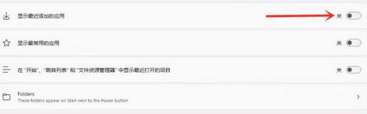 4、将“显示最近添加的应用”关闭后设置即可完成。