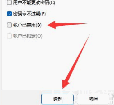 5、进入后取消“账户已禁用”并确定,最后重启电脑就能正常登录那个账号了。
