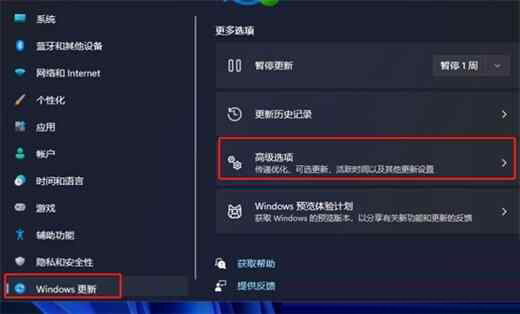 3、进入窗口设置中,在左侧选择Windows更新,右侧点击高级选项。