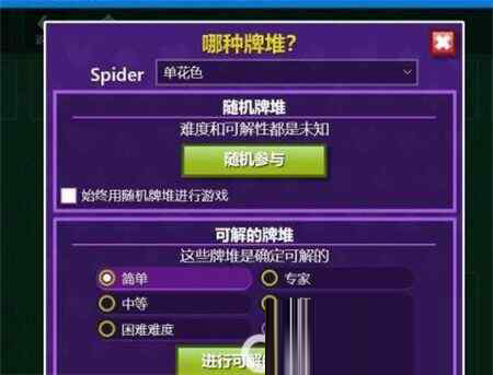 4、点击Spider就进入了蜘蛛纸牌的游戏界面了,先是选择什么样的牌以及难度