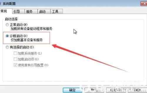 2.出现系统配置界面后,直接在常规下点击诊断启动,随后重启电脑。