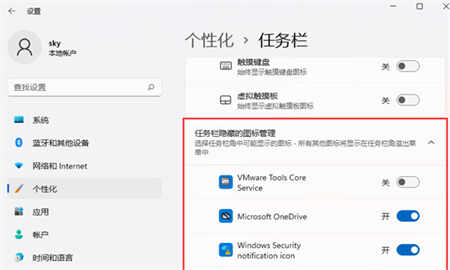 3、找到任务栏中的【隐藏的图标管理】,点击开关按钮,将不需要显示的图标隐藏起来;