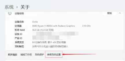 3、然后在关于中找到相关链接中的“高级系统设置”