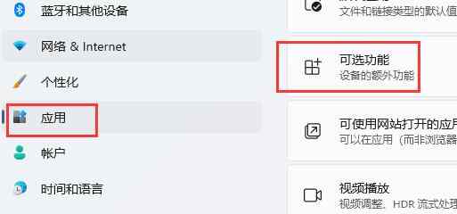 2、点击左侧的“应用”,再进入右侧的“可选功能”