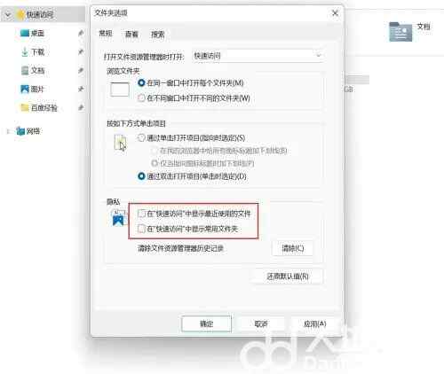 3、勾选在快速访问中显示最近使用的文件和在快速访问中显示常用文件夹,点击应用后点击确定即可。