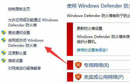 2、然后点击左边“ 启用或关闭Windows defender防火墙 ”