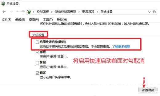 6. “关机设置”这里,将“启用快速启动”前面的对勾取消,保存设置。