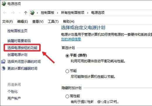 4. 电源选项窗口中,左侧点击“选择电源按钮的功能”。