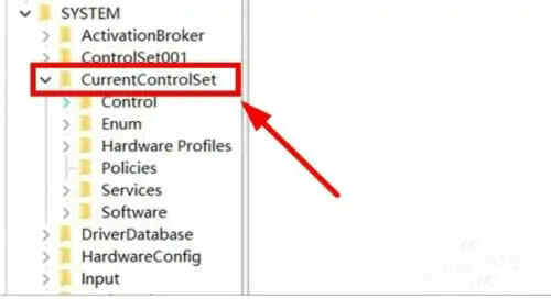 3、点击CurrentControlSet:在下拉窗口中,点击选择SYSTEM目录下的CurrentControlSet选项。