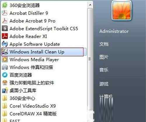 3、运行msicuu2.exe后发现桌面没有快捷方式,在窗口-所有程序中找到“Windows Install Clean Up”点击即可操作。