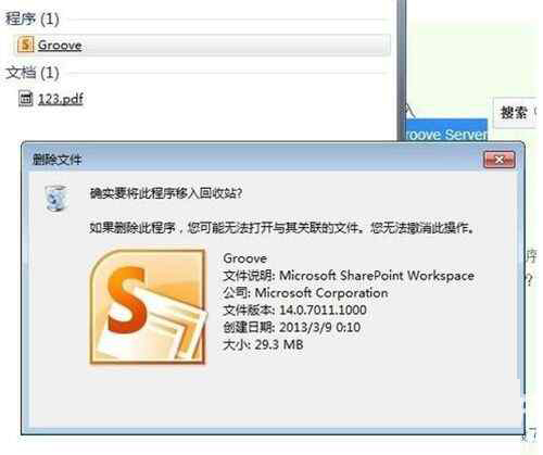 6、我们选择“窗口”,在“运行”栏输入Groove或 Microsoft Groove Sercer查找到该程序,选择右键-删除即可。