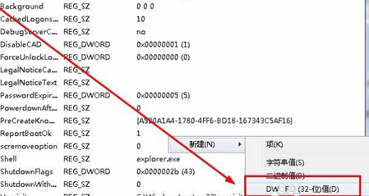 4、选中Winlogon后,我们在右侧空白的地方单击鼠标右键,选择新建“DWORD 32位值”。