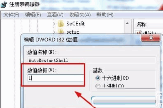 7、选择修改后会弹出一个编辑DWORD值对话框,我们将这个注册表的数值数据修改为1,然后点击确定,这样我们再重新打开资源管理器就不会出现崩溃重启的问题了。