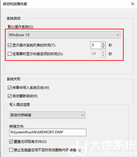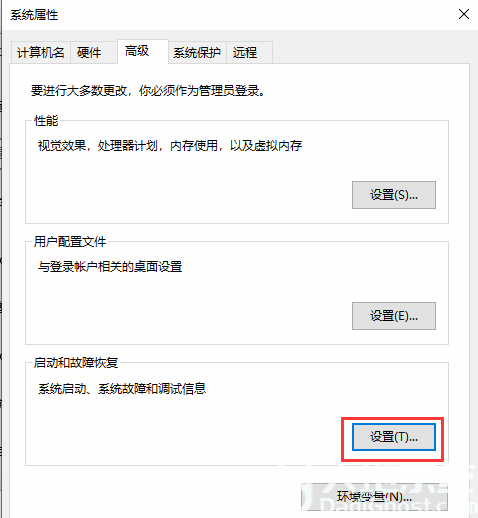 6、点击弹出窗口上方的“高级”栏目,再点击“启动和故障恢复”下方的“设置”选项。