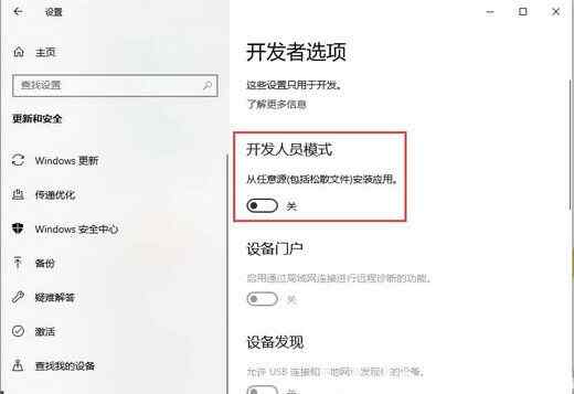 4、将窗口右侧的“开发人员模式”下面的开关开启。