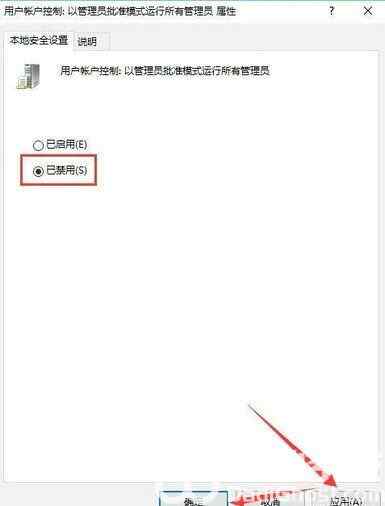 3、在右侧找到用户账户控制:以管理员批准模式运行所有管理员,双击打开,选择已禁用点击确定;