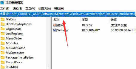 2、进入“计算机\HKEY_CURRENT_USER\Software\Microsoft\Windows\CurrentVersion\Explorer\StuckRects3”路径