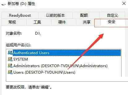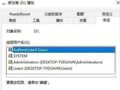 部分win10用户在打开d盘的时候弹出了”请确认d盘是否具有读写权限“的提示,像这个问题要怎么解决呢?在d盘上右键打开属性窗口,接着切换到安全选项卡,在组或用户名栏目中查看下文图示账户是否都有,如果没有的话,点击编辑按钮,将缺少的账户添加进去,最后保存设置,这个时候d盘就能正常打开了。