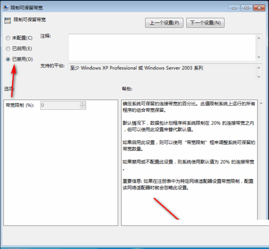 6、最后将“限制可保留宽带”禁用,点击确定即可。