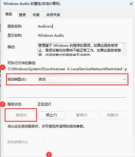 4、Windows Audio 的属性(本地计算机)窗口,常规选项卡上的启动类型框中,选择【自动】。在服务状态选项中,选择【启动】,然后点击【确定】。